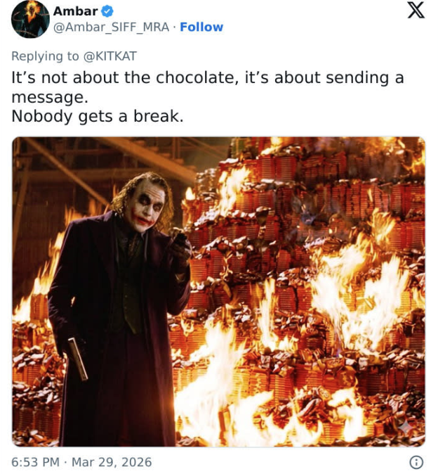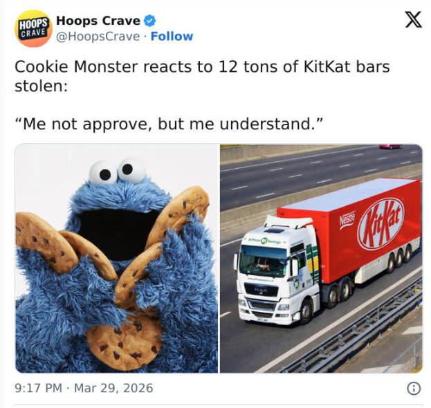 Sometimes you’re a festering boil on the ass of humanity, and I despair of the future of the species. But then someone actually kit-naps (sorry) 12 tons of KitKat bars, like that’s something they can just fence somewhere, and the internet goes to work.